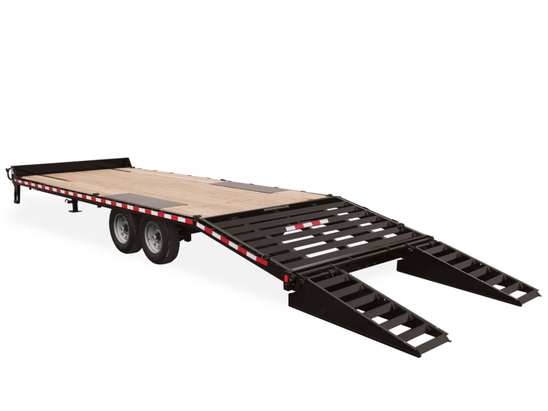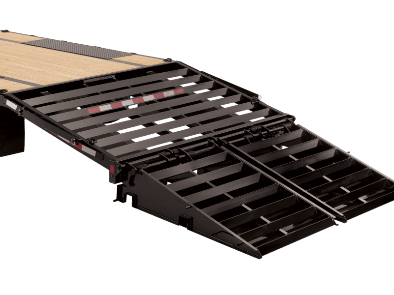 Whether hauling heavy machinery or material, this Heavy Duty Low Profile Deckover is perfect for any task. Heavy I-Beam frame and Cross-Trac™ bracing provide superior structural support and help to stabilize the trailer by transferring extreme loads evenly to the frame. A pierced frame allows for easy deck access, and provides a save and optimal loading angle for machinery. Stake pockets, chain spools, and D-rings provide optimal tie down points, and the powder coat finish provides additional protection against road elements. Heavy duy I-Beam Gooseneck and universal full-width ramps are a few options to help customize the trailer to your specifications.