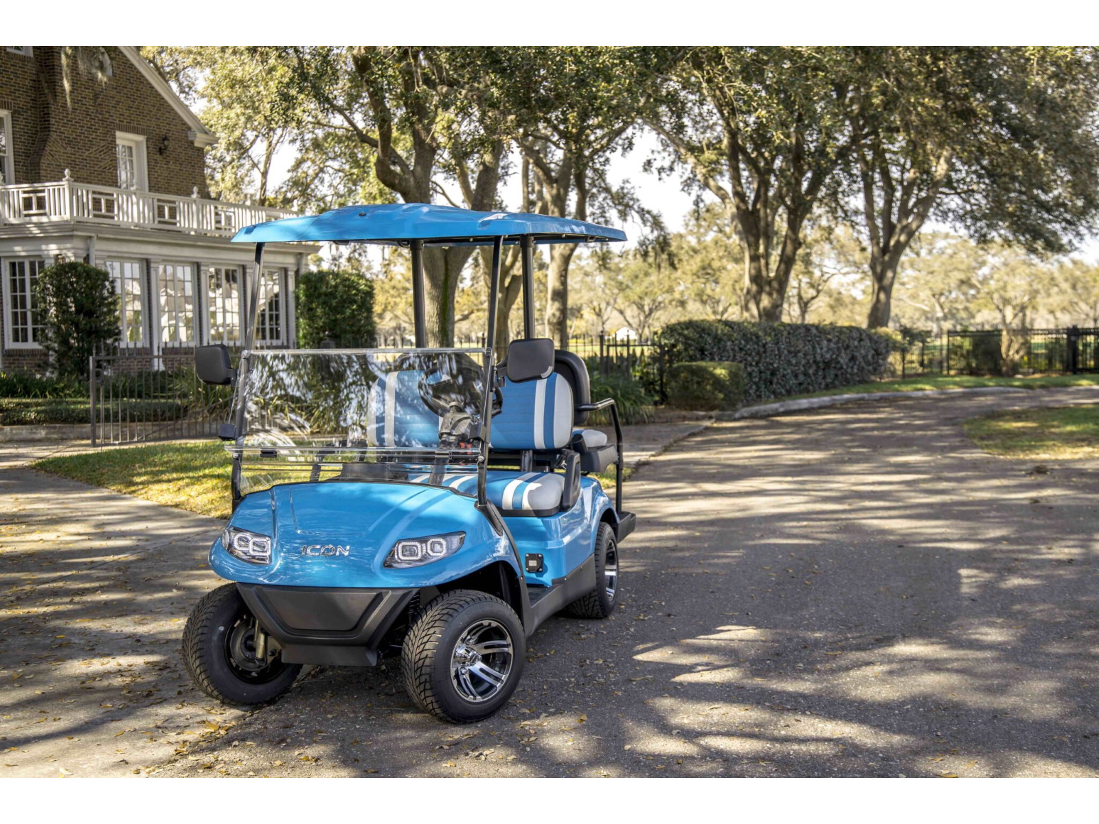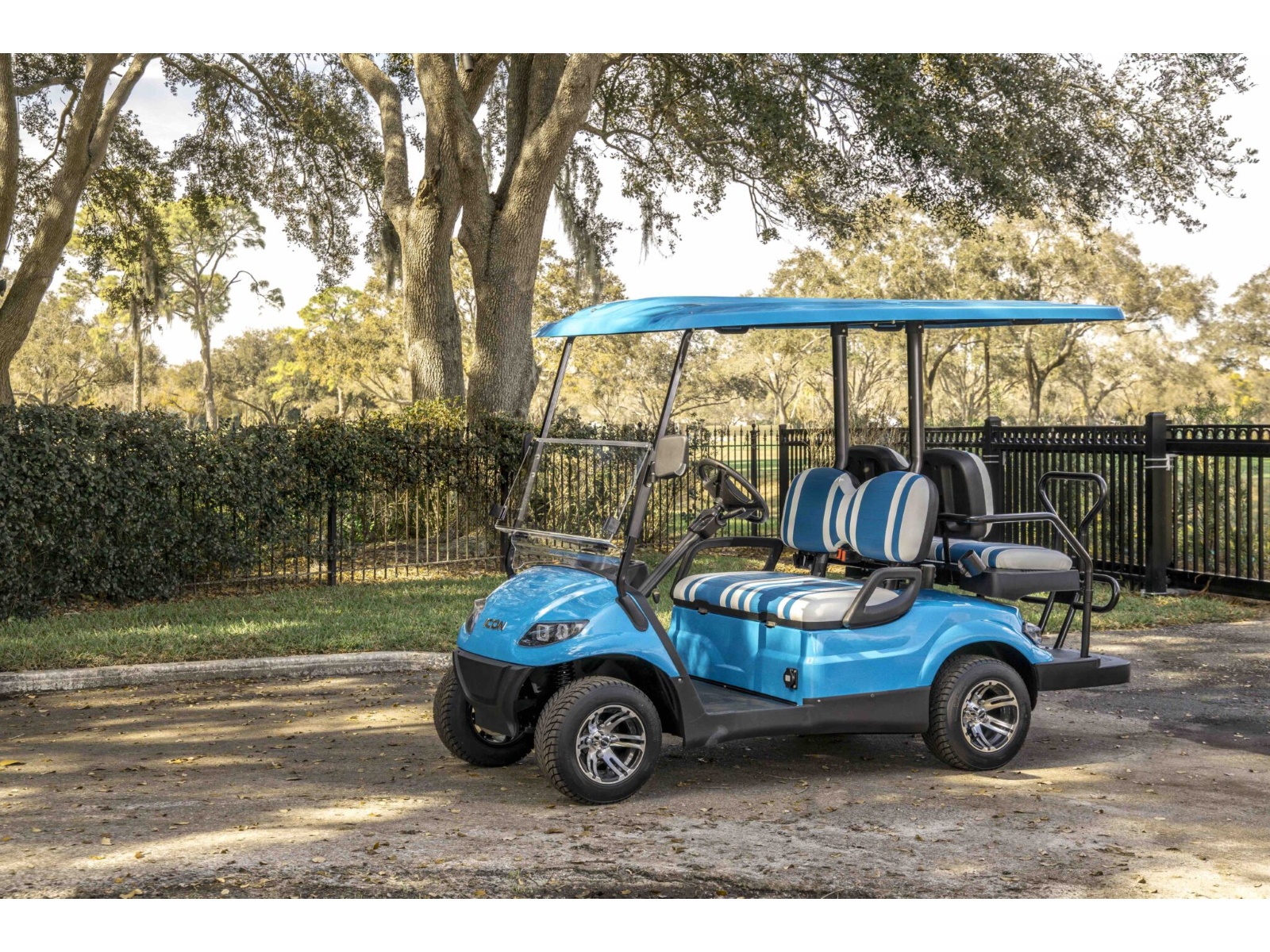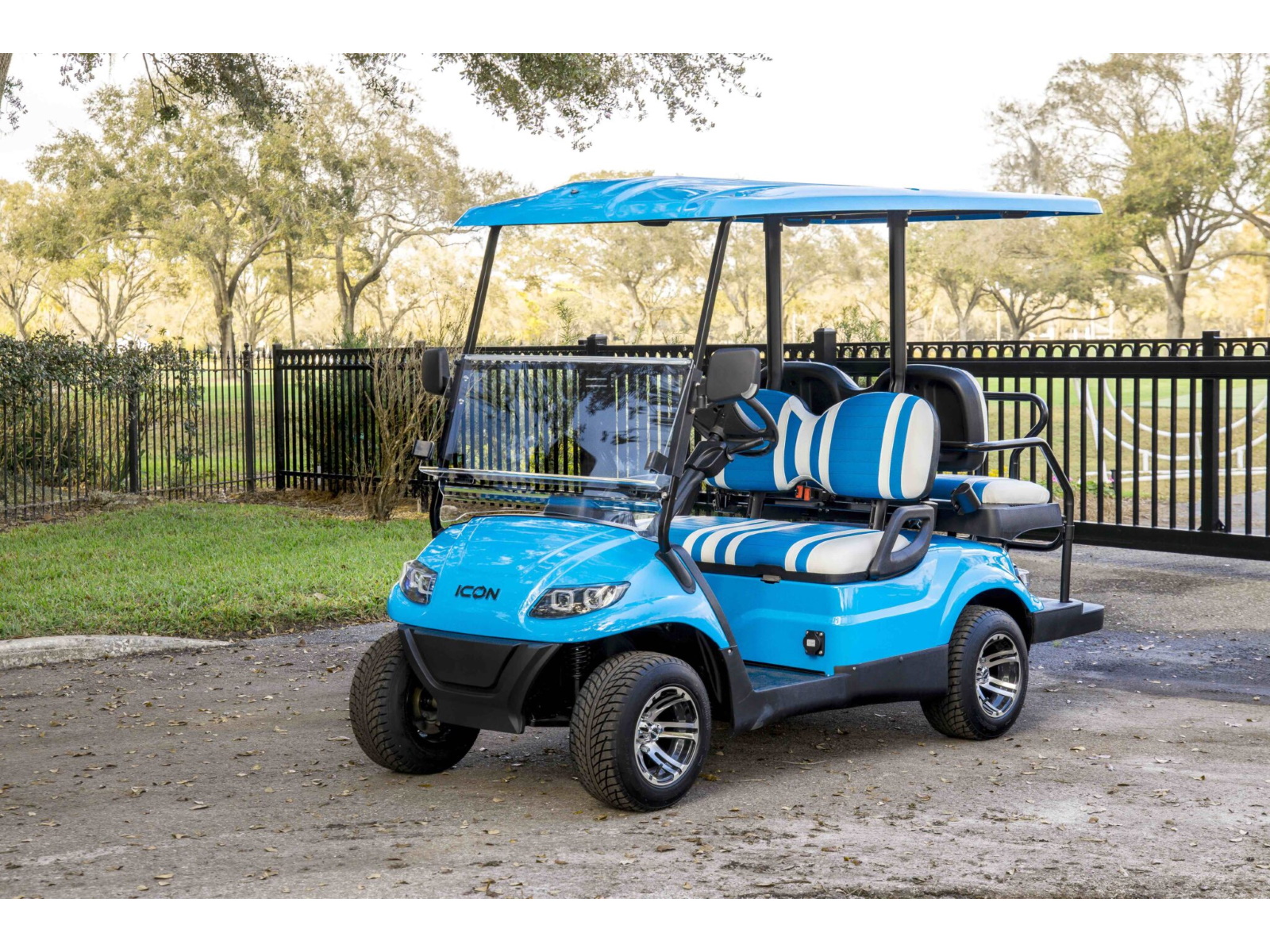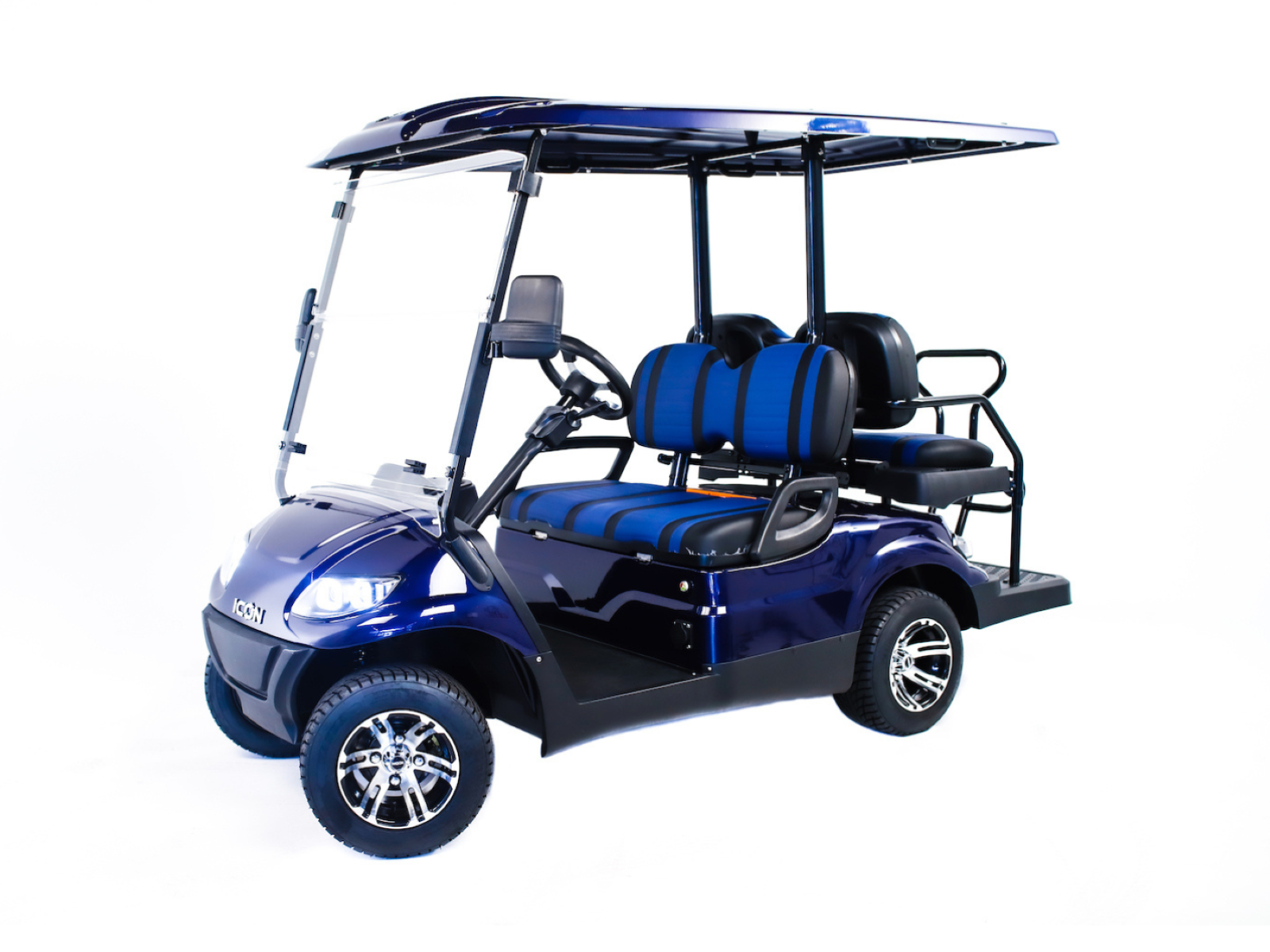 The ICON® i40 four-seater golf cart is the epitome of perfection when it comes to residential and commercial needs. Whether you’re taking your friends to lunch or transporting potential clients’, the ICON® i40 is stylish and extremely comfortable. Plus, it’s loaded with premium features like 12′′ aluminum wheels, 4-wheel disc brakes, powder-coated steel chassis, lights, turn signals, high-speed rear ends, durable front and rear bumpers, painted rooftops, horns, digital gauges, and more!